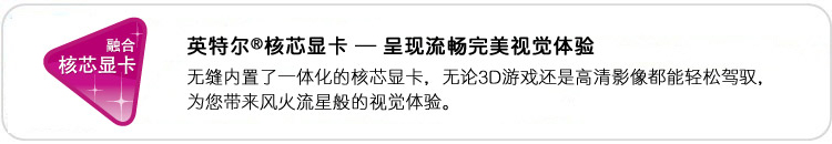 核芯显卡拥有诸多优势技术,可以带来充足的图形处理能力,相较前一代产品其性能的进步十分明显。核芯显卡可支持DX10、SM4.0、OpenGL2.0、以及全高清Full HD MPEG2/H.264/VC-1格式解码等技术,即将加入的性能动态调节更可大幅提升核芯显卡的处理能力,令其完全满足于普通用户的需求。