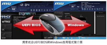 特色 - 全新图形用户界面,同时支持UEFI BIOS与Windows应用程序 - 只要透过鼠标点击、拖曳,甚至是触控面板来调校系统设定 - 完整的系统设定、硬件监测、超频选项与安全性控制