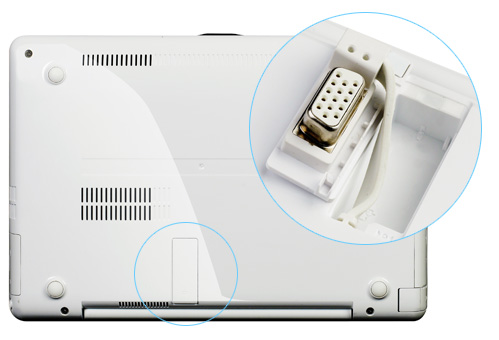 Eee PC™ 贝壳机提供独创VGA接头,位于机身底部,不使用时可收起来。通过VGA接头您可以将Eee PC的画面显示在大屏幕上,让您不论是做汇报或是观看电影都很方便!