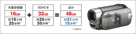FS37不仅机身内置了一个16GB的存储器,还在机身上设计有一个存储卡插槽,通过外插SDHC存储卡来扩充摄像机容量。如果外插一张32GB的存储卡,则FS37总容量可达48GB,可记录时间长达约31小时15分钟。