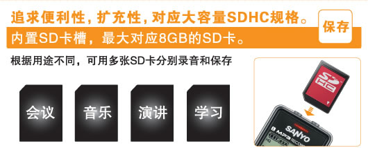 1、 行业内首款实现完全自主扩卡功能的专业录音笔,最大支持8G 容量SD卡。为了保证高音质录音,推荐使用“sandisk”品牌SD卡。