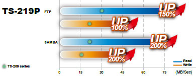 - Testing Method: Connect the TS-219P and PC to switch, upload/ download 3GB file, FTP program: FileZilla 3.1.5