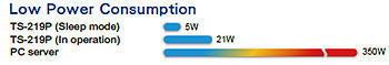 优异的效能表现及丰富的服务器功能 搭载Marvell 1.2GHz CPU、512MB DDRII内存、支持双插槽且硬盘可热抽换的TS-219P在同时多人存取多项服务器应用时,仍具有优异的效能表现。TS-219P可支持Windows, Mac, Linux及UNIX等跨平台的服务,领先业界的服务器功能包含内iSCSI应用(最多可支持八组iSCSI 装置)、在线磁盘阵列容量扩充(Online RAID Capacity Expansion)与在线磁盘阵列组态迁移(Online RAID Level Migration)、网络自动IP联机过滤、磁盘使用状态报告、透过手机接收系统SMS讯息、电源开关机排程管理及支持2支网络摄影机的安全监控中心的等强大功能。