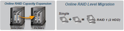 在线RAID组态迁移 在线RAID组态迁移让使用者可透过简易步骤,在不停机且保留数据的状态下进行RAID等级迁移。