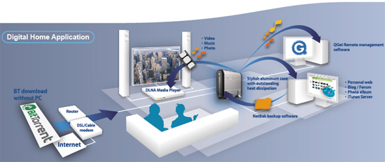 内建TwonkyMedia的UPnP媒体服务器 Turbo NAS可当成是一个的多媒体储存中心。它可以与UPnP/ DLNA的媒体播放器兼容。透过Turbo NAS与媒体播放器的相结合,您可以不需透过计算机,直接在电视上播放数字的相片或是影片。您也可以透过同样的方式,收听您最喜爱的音乐及网络广播。内建之DLNA TwonkyMedia 4.4.5的版本升级,支持最普及的DivX格式影片串流至Sony PS3游戏机播放,让Sony PS3可以发挥更多音乐相片与影片的网络分享功能。Turbo NAS也可以透过PSP无线连结聆听音乐。更可以用Nokia手机的DLNA control point的功能来遥控数字媒体播放器播放影像及音乐文件。 |