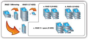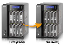 在线RAID容量扩充 RAID容量扩充让使用者可在保留所有数据、不停机的情况下,一步一步地顺利的进行RAID容量扩充。