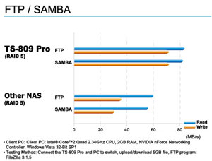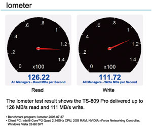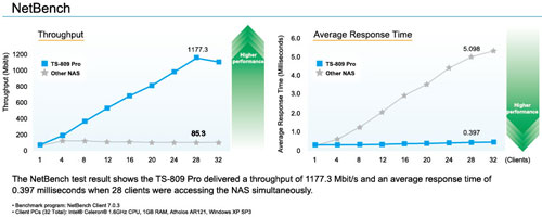 搭载Intel Core2 Duo 2.4GHz CPU、2GB DDRII 内存、支持8颗硬盘以及支持热抽换设计。TS-809 Pro提供了先进的RAID磁盘阵列管理功能,只要透过简单页面设定即可轻松完成设定,其中包括RAID 0/ 1/ 5/ 6/ 5 + Spare,Single及JBOD。支持在线RAID容量扩充的功能,让使用者可以在初期建置系统时仅购买最具价格优势的硬盘,并且等到未来使用容量需求扩增时再行购买新的硬盘来作容量扩充。在线RAID组态迁移的功能,让使用者可以在初期少量购买硬盘,当未来希望升级RAID的备援等级时,也能够在不停机且保留数据的状态下做RAID等级的迁移。