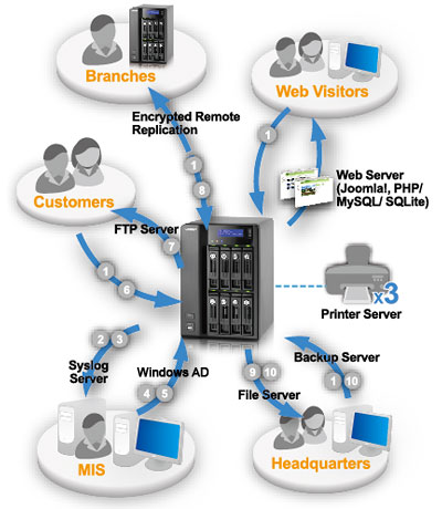 多功能的服务器 TS-809 Pro提供各种先进强大的应用功能,支持Windows, Mac, Linux 及Unix 跨平台的档案分享,并且包括有PHP MySQL/SQLite的网站服务器、打印机服务器 (最多可同时支持三台)、档案服务器等企业所需的功能。同时,拥有多种数据储存和管理的安全机制:FTP服务器使用SSL/TLS加密技术、SSH远程登入及网页接口的SSL登入,让使用者可以安全地传递,储存及分享数据。