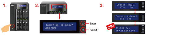 Touch-N-Go LCD快速安装 您可以使用方便的LCD屏幕作RAID组态的快速安装,只需要三个步骤,系统会自动格式化硬盘以及建立RAID组态。
