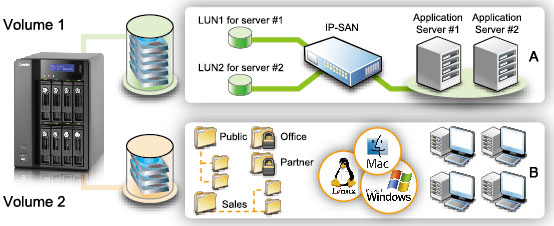 A. iSCSI 应用: 应用服务器的容量扩充 B. NAS 应用: 透过 SMB/CIFS, AFP 及 NFS的档案分享