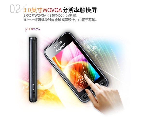 时尚镜面全触摸屏设计,内置手写笔,时尚达人的必要装备,炫酷体验轻松掌握; 11.9毫米纤薄机身,轻轻盈盈展示灵巧外形; 3.0英寸WQVGA(240x400)分辨率,26万色TFT彩屏,让眼球感受超炫的视觉冲击; |