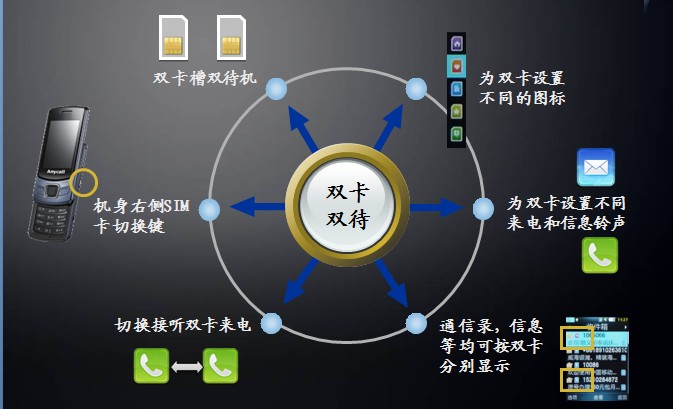 - 双卡双待,双卡同时待机,协调不同身份; - 可以是不同运营商两个号码,一部机器,选择最经济的通话方式; - WAP/MMS/电子邮件,两卡可以分别使用。 |