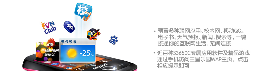 - 预置多种联网应用,校内网、移动QQ、电子书、天气预报、新闻、搜索等,一键接通你的互联网生活,无间连接; - 近百种S3650C专属免费应用软件及精品游戏,通过手机访问三星乐园WAP主页,点击相应提示即可1。