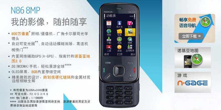•800万像素,广角卡尔蔡司光学镜头,带来可以媲美数码相机的专业照相效果 •内置诺基亚地图与网络辅助GPS(A-GPS), •特别设计的双向滑盖即可自动开启游戏模式 •内置高达8GB存储空间