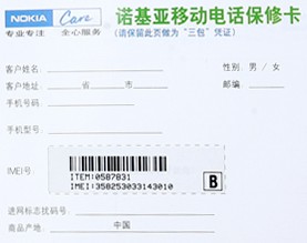 温馨提示:如图所示,请您在签收诺基亚手机的同时仔细检查保修卡上是否有贴上B贴,如保卡上无B贴,再检查包装盒上的串码贴,如果有,请将B贴贴在保卡的相应位置并妥善保管,如果您的保卡遗失将无法正常享受厂家提供的三包服务。