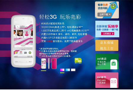 时尚设计配搭炫亮彩壳;3G(WCDMA)高速上网,轻松漫游全球,1,600万色高品质3.2英寸nHD宽(16:9)触摸屏;3.6Mbps的下载速度;内置2G卡,卡内预装了10个互联精灵和诺基亚地图3.0; |
