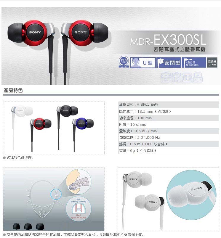 品名:索尼 (SONY )MDR-EX300SL 入耳式耳机 品牌:索尼 (SONY ) 型号:MDR-EX300SL 颜色:白色 机式类型 耳塞 佩戴方式 入耳式 频率响应 5-24000Hz 功率 100mW 阻抗 16欧姆 灵敏度 105 插头 3.5mm插头(镀金) 喇叭直径 13.5mm 线缆长度 0.6m 其他性能 总谐波失真: < 0.3% 产品附件 三对不同尺寸耳套、耳机收纳盒、0.9m耳机延长线