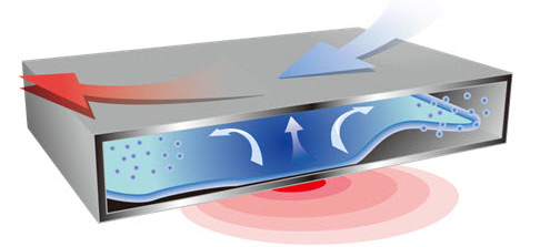 Vapor Chamber (均热板)技术是利用真空/高压/毛细作用传导热。当热由热源传导至蒸发区时,腔体里的冷却液在低真空度的环境中受热后开始产生冷却液的气化现象,气相的冷却介质迅速充满整个腔体,接触到一个比较冷的区域时便会产生凝结的现象释放出累积的热,借由微结构的毛细管道再回到蒸发热源处,此运作将在腔体内周而复始进行,有效降低晶片工作温度,增加显示卡工作效能不受高温影响.。