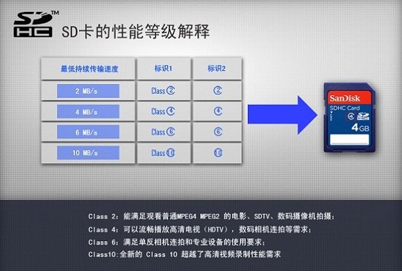按照 SDA协会阐述的,Class是用来描述最低连续传输速度的标记。在连续传输速度在2MB/s以上的称谓CLASS 2, CLASS 4则是连续传输速度在4MB/s以上,CLASS 6则是连续传输速度在6MB/s以上。目前最高的是CLASS10。需要提醒的是,各个存储卡生产厂商在使用CLASS等级标记时也有自己的速度规范标准。CLASS等级主要参考价值在连续摄像情况,CLASS4可以使用高清1080P状况下的录像。SanDisk SD卡,理论读写速度达到15MB/s,但仍然使用CLASS 4的标记。而部分厂商,则为商业目的,标高CLASS等级,来蒙蔽不知情的消费者,结果在录像视出现图像断续的现象。所以在选购SD系列产品时,要注意产品的实际读写速度,而并不要只看CALSS等级。
