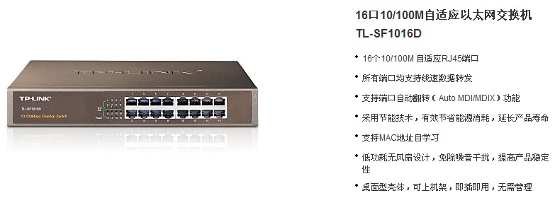 TL-SF1016D是TP-LINK公司开发的桌面型二层百兆非网管以太网交换机产品,提供16个10/100M自适应RJ45端口,所有端口均支持线速转发和MDI/MDIX自动翻转功能,即插即用,无需管理。
