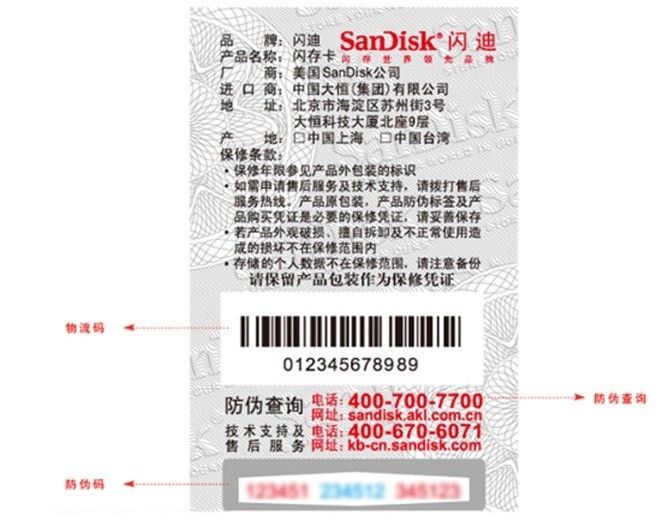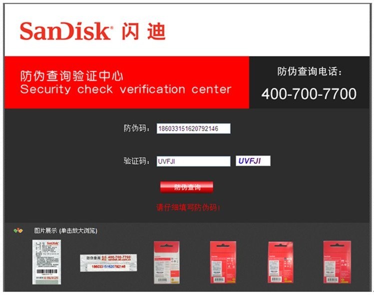 1.拨打SanDisk官方防伪验证电话:400 700 7700,进行在线人工查询。 2.登陆SanDisk官方防伪验证网站:sandisk.akl.com.cn,输入(图一)中文标贴指示的防伪码和网站(图二)提供的验证码进行查询。