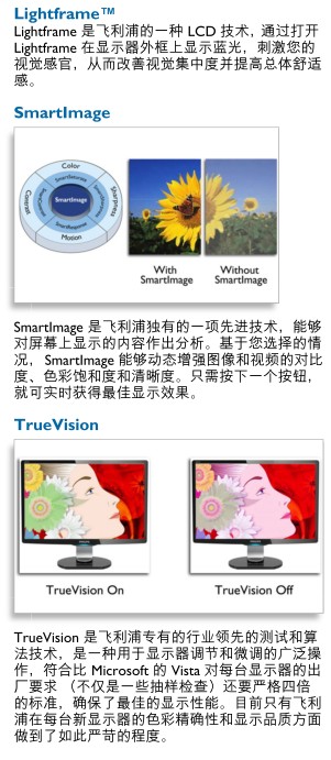 专为视觉舒适而打造! 利用创新的 Lightframe LCD 技术减少眼部疲劳 可为整个家庭提供视觉舒适、减少疲劳的独特视觉体验,并且格调优雅、外观醒目, Lightframe LCD 堪称视觉盛宴,专为长时间在电脑屏幕前工作的人们设计。 非凡的观赏体验,不会出现视觉疲劳 •借助创新技术减少眼部疲劳 • SmartImage:带来更优质的用户友好型显示体验 •TrueVision:提供实验室水准的显示性能 •高光钢琴白表面,提升您的居室品位 享受完美的视觉盛宴 • SmartContrast12000:1 可反映极其丰富的暗部细节 •快速响应时间可达 2 毫秒 •DVI-D 输入和 HDCP 支持 便捷设计 •双路输入,可同时接收模拟 VGA 和数字 DVI 信号 •在宽屏幕格式和 4:3 宽高比之间进行单键格式转换 •USB 端口,连接外围设备更方便