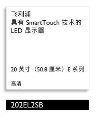 雅致的 LED 显示屏,再现自然的色彩 202EL2 LED 显示屏以其雅致的设计、时尚的 SmartTouch 控件、SmartContrast 和 SmartImage lite 技术,成为您的理想选择 卓越的画质 • LED 技术确保色彩鲜艳自然 •支持高清内容显示 • 16:9 显示屏带来绝佳的宽屏幕游戏和视频体验 • SmartContrast 20000000:1 可反映极其丰富的暗部细节 出众的设计为您的居室环境增辉添色 •时尚雅致的设计,装点您的家居生活 •表面光滑,提升装饰品位 •时尚 SmartTouch 控件 绿色环保设计 •能源之星节能水平高、功耗低 •符合主流国际标准的环保材料 卓越的便利性 • SmartControl Lite 让您可轻松调谐显示性能 •在宽屏幕格式和 4:3 格式之间轻松地进行画面格式控制