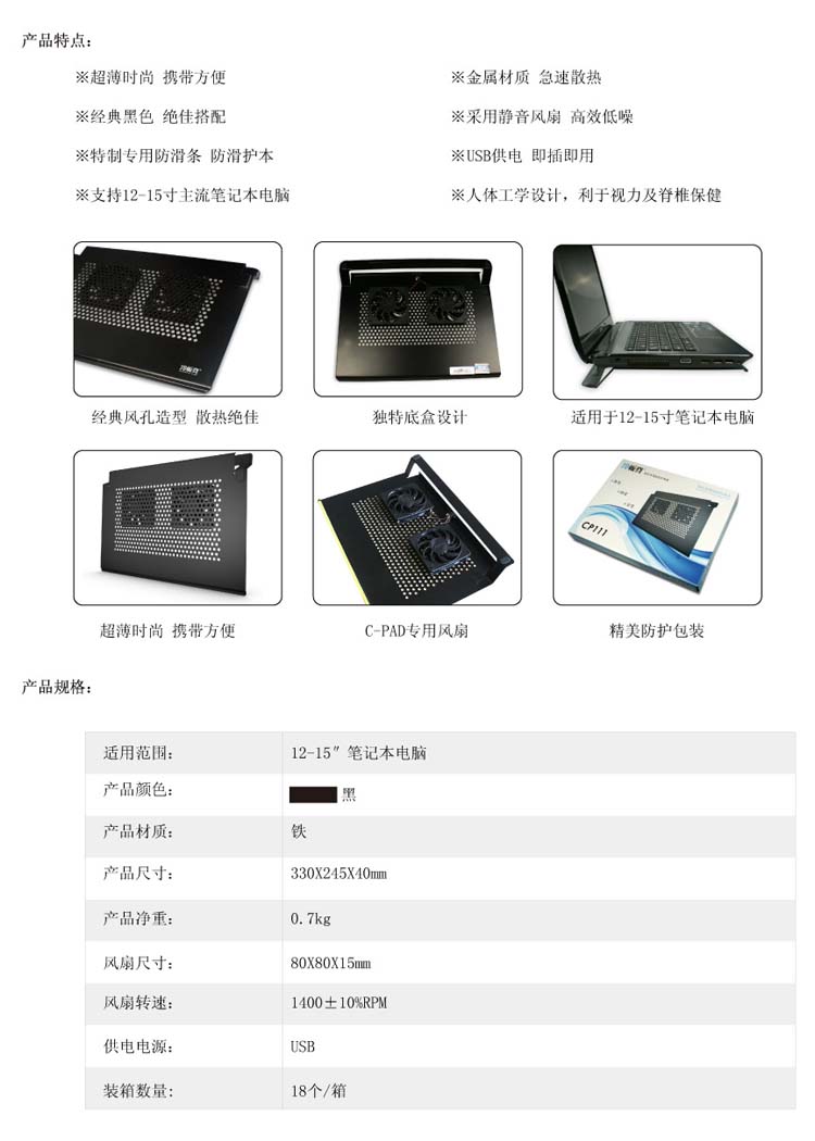 商品名称:冷板凳 CP111 笔记本散热器 黑色 适用于12-15寸笔记本电脑