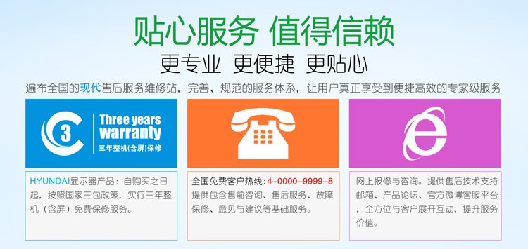 本产品全国联保,享受三包服务,质保期为:三年质保 如因质量问题或故障,凭厂商维修中心或特约维修点的质量检测证明,享受7日内退货,15日内换货,15日以上在质保期内享受免费保修等三包服务! 售后服务电话:4000099998 品牌官方网站:http://www.hyundaiit.com.cn/