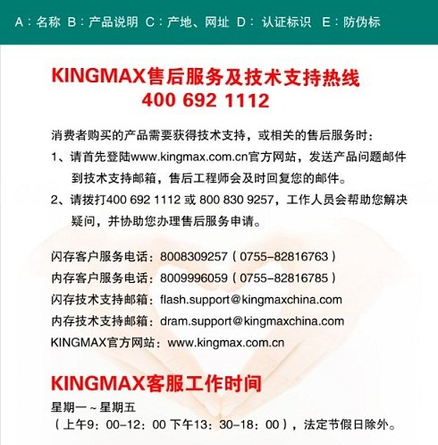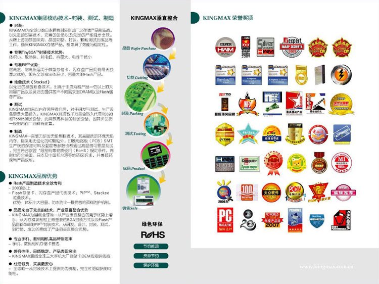 品牌介绍: Kingmax集团于1989年成立于台湾,Kingmax集团是全球模块制造厂商中,第一家具备自有的封装及测试设备。集团旗下的Kingpak Technology Inc.拥有一流的设备以及顶尖的技术人员,掌握了完整的核心技术,将所有生产流程垂直整合,从上游的晶圆切割、封装、测试、到产品研发、设计等所有流程都包含在内。