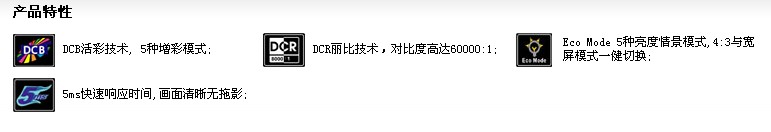 DCB活彩技术, 5种增彩模式; DCR丽比技术,对比度高达60000:1; Eco Mode 5种亮度情景模式,4:3与宽屏模式一健切换; 5ms快速响应时间,画面清晰无拖影; |